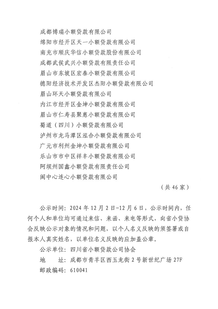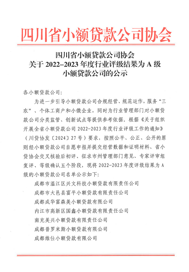 關于四川省小額貸款公司2022-2023年度行業評級A級公司的公告